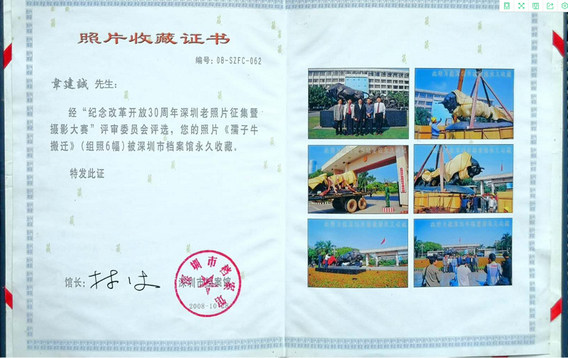 “一開始,我提出這個遷移建議時,還是有點忐忑的,后來得知‘孺子?!袼軐⒁浦潦形笤和夂螅曳浅8吲d,這樣一來,跟‘孺子?!嫌熬头奖愣嗔搜剑 薄叭孀优!钡袼苓w移當(dāng)天,韋建誠興奮地拿起相機,用鏡頭定格下整個搬遷過程?!澳且惶焓俏胰松铍y忘的日子之一,既是我44歲生日,又是‘孺子牛’雕塑安新家之日。”回憶起當(dāng)時的情況,韋建誠還是十分興奮。而韋建誠拍攝的組照后來被深圳市檔案館永久收藏。深圳市委辦公廳還將《市民希望將“孺子牛”雕塑移至市府大院外》評為一等獎。