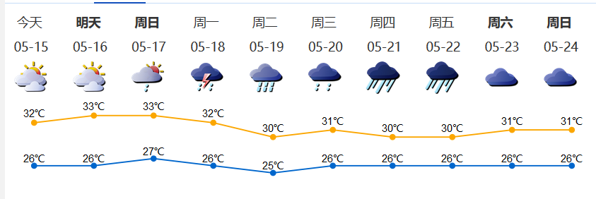 我市多云間晴天,局部有短時(雷)陣雨;氣溫26-32℃;東南風2-3級;相對濕度60%-90%。
