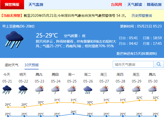 市氣象局預計,21日凌晨到22日早晨深圳市有暴雨局部大暴雨,并伴有雷暴和8級左右短時大風,強降水主要影響時段在21日午后至22日早晨;22日白天降水減弱,23日轉(zhuǎn)(雷)陣雨天氣。