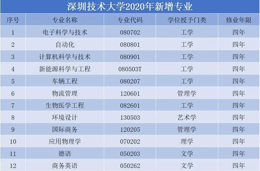 據教育部2019年本科專業(yè)備案和審批結果,在2019年機械設計制造及其自動化、物聯網工程、光源與照明、交通運輸、汽車服務工程、工業(yè)設計等6個專業(yè)的基礎上,2020年,深圳技術大學將新增12個專業(yè),屆時招生專業(yè)將達18個。
