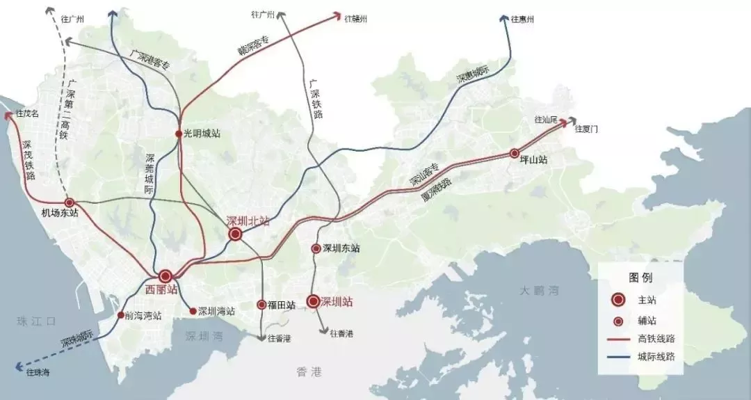 西麗綜合交通樞紐將引入贛深客專、深茂鐵路、深汕鐵路、深珠城際4條高鐵,深惠城際、深莞增城際2條珠三角城際鐵路和軌道13、15、27、29號(hào)線4條城市軌道。