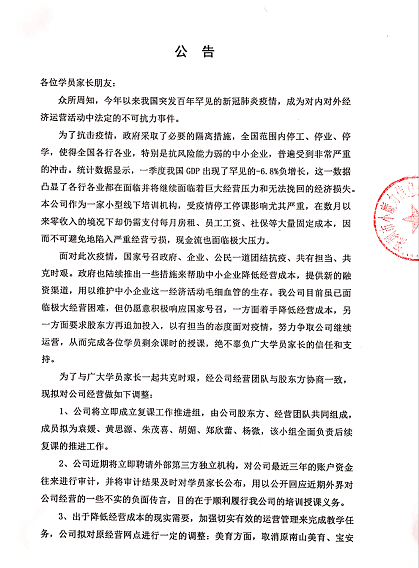 公告稱,公司成立由股東和老師組成的復課工作推進組,申請早日復課,時間初定于6月中旬;并將聘請外部第三方獨立機構審計賬戶資金,澄清不實經(jīng)營傳言;還將取消寶安、南山兩個經(jīng)營網(wǎng)點,所有美育學生安排去福田上課。