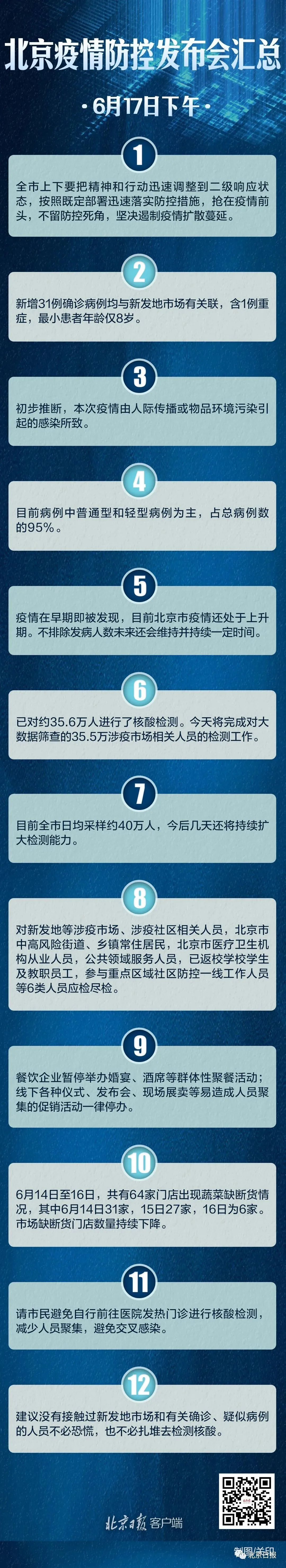 北京新冠肺炎疫情防控工作領(lǐng)導(dǎo)小組檢疫檢測工作組副組長、市委組織部副部長張強(qiáng)介紹,6月13日起,已迅速對新發(fā)地等出現(xiàn)疫情的市場人員、周邊小區(qū)居民、大數(shù)據(jù)排查涉疫市場人員,社區(qū)敲門行動(dòng)中主動(dòng)報(bào)告、有關(guān)接觸史的人員以及全市各農(nóng)貿(mào)市場工作人員約35.6萬人進(jìn)行了核酸檢測。6月17日將完成對大數(shù)據(jù)篩查的涉疫市場相關(guān)人員的檢測工作,對重點(diǎn)行業(yè)、重點(diǎn)領(lǐng)域、重點(diǎn)地區(qū)人員的核酸檢測工作也在同步進(jìn)行。