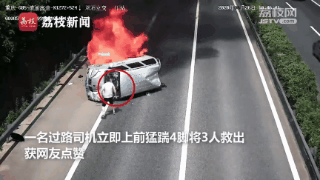 近日,重慶一面包車高速上突然失控,撞向護(hù)欄側(cè)翻,隨即起火,車內(nèi)3人被困。一名司機(jī)路過,上去4腳踹碎擋風(fēng)玻璃,助3人脫困。