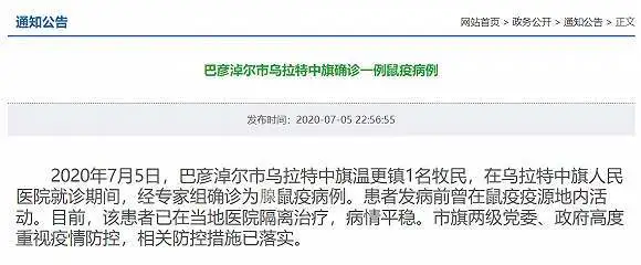 7月5日傍晚,內蒙古巴彥淖爾市衛(wèi)生健康委員會發(fā)布通告稱,烏拉特中旗人民醫(yī)院報告了1例疑似腺鼠疫病例,經(jīng)研究決定,于7月5日發(fā)布鼠疫防控Ⅲ級預警。當天晚間,巴彥淖爾市衛(wèi)生健康委員會再次發(fā)布通告稱,該市烏拉特中旗確診一例鼠疫病例。