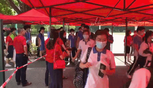 八點(diǎn)十分,學(xué)生走入考場,身穿紅色衣服的老師在兩側(cè)為考生送上祝福?!凹佑?!”“老師我們出發(fā)了?!弊8B暣似鸨朔?。