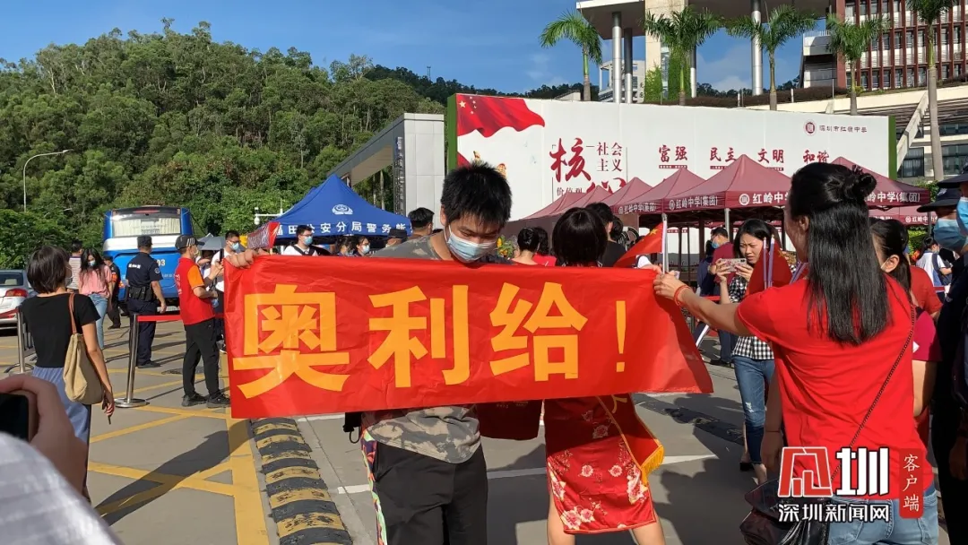 一名考生的學(xué)長(zhǎng)來到深圳紅嶺中學(xué)考點(diǎn)門口,為學(xué)弟舉起“奧利給”的旗子!