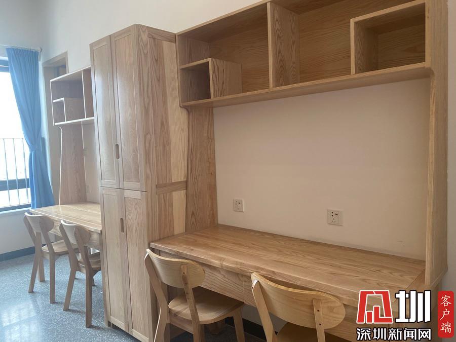 宿舍樓內(nèi),每套學(xué)生宿舍41.8平方米,采用2+1模式,2個(gè)獨(dú)立的房間各居住4人,一個(gè)共用衛(wèi)生間。一方面做到干濕分區(qū),臥室舒適度更好;另一方面做到學(xué)生分散,臥室靜謐性更好。同時(shí),室內(nèi)家具均采用“全實(shí)木+環(huán)保水性漆”,包括床、衣柜、書桌、書柜與椅子等;每一層宿舍樓均設(shè)有觀景平臺(tái)。此外,宿舍配備空調(diào),太陽能熱水器,并在每棟宿舍二樓都設(shè)置了自助洗衣房。