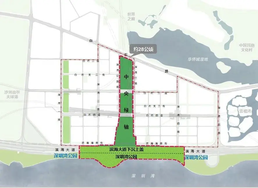 今年6月6日上午,該基地舉行中央綠軸項目開工活動,此次開工的中央綠軸項目南北全長約1.0公里,最大寬度達210米,是連接塘朗山——華僑城濕地——深圳灣“通山達?!钡暮诵目臻g軸線。隨著濱海大道深超總段下沉工程建設,未來深超總紅線內景觀將與深圳灣公園無縫銜接,共同構成南北貫通的中央綠軸體系。