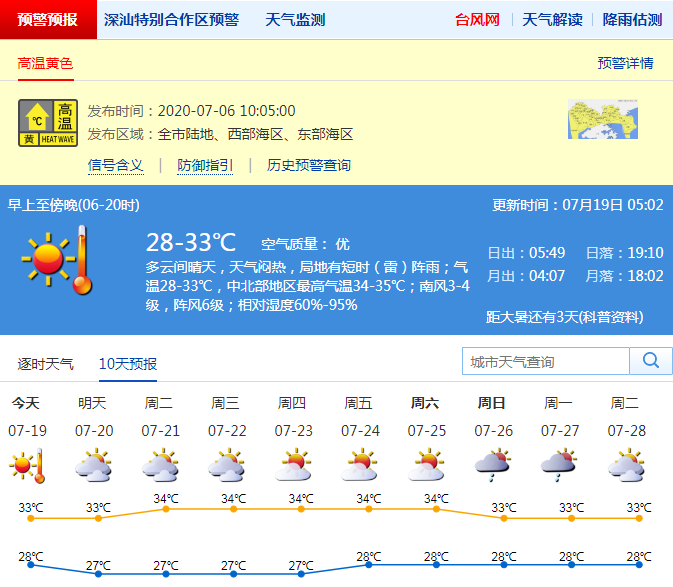 見圳客戶端·深圳新聞網2020年7月19日訊 深圳市氣象臺預計,19-20日我市多云間晴天,局地有短時(雷)陣雨,氣溫28℃-33℃,中北部最高氣溫34℃-35℃;21-25日晴天到多云,局部偶有短時(雷)陣雨,悶熱加劇。