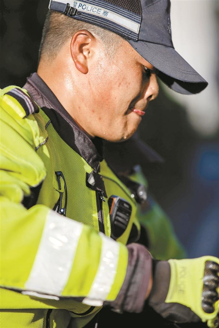 “深圳最近的天氣太熱了,到了中午,地面溫度估計得有40℃了,我們因為戴著口罩,外頭還得加上頭盔,感覺確實挺難受的。”深圳交警南山大隊機訓中隊的鐵騎小哥時云財,每天早高峰開始就駕駛鐵騎穿梭在大街小巷,直到中午太陽最盛的時候。摘下頭盔,眼睫毛上都是汗滴,更不用說脫下熒光黃的制服,里面是層層疊疊早已被浸透發(fā)白的衣衫。