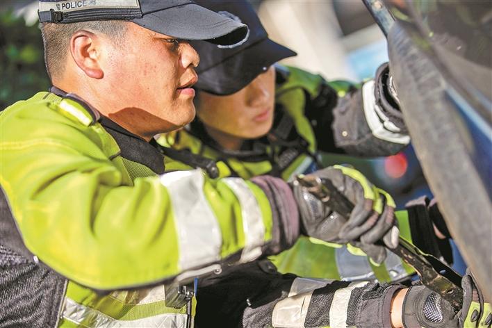 時云財和同事馬上幫助陳先生從車后備箱拿出換胎工具和備胎,在保證安全的前提下,僅用10分鐘就更換好輪胎?!疤兄x你們了,深圳交警‘小黃人’真的是我們最信任的人,有你們在我覺得上路開車就很放心?!标愊壬蛔〉馗兄x、稱贊交警鐵騎小哥。