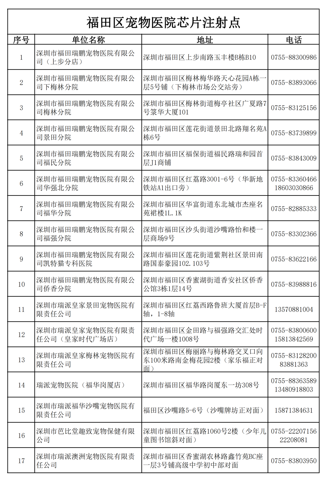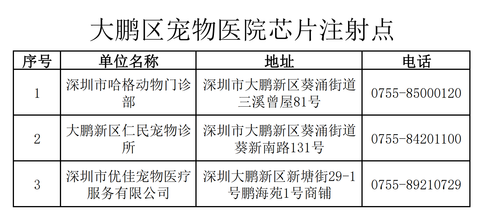 據(jù)福田區(qū)城市管理和綜合執(zhí)法局市容管理科副科長(zhǎng)羅偉介紹,犬只芯片植入工作目前已在深圳市福田瑞鵬寵物醫(yī)院梅林分院、瑞派皇家寵物醫(yī)院時(shí)代廣場(chǎng)店完成試點(diǎn),隨后將在全區(qū)33個(gè)寵物醫(yī)院陸續(xù)開放芯片植入工作。