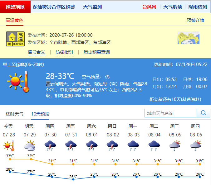 見圳客戶端?深圳新聞網(wǎng)2020年7月28日訊 根據(jù)深圳氣象局官方消息,7月28日白天多云間晴天,天氣悶熱,有短時(shí)(雷)陣雨;氣溫28-33℃,中北部最高氣溫可達(dá)35℃以上;西南風(fēng)2-3級;相對濕度60%-90%。