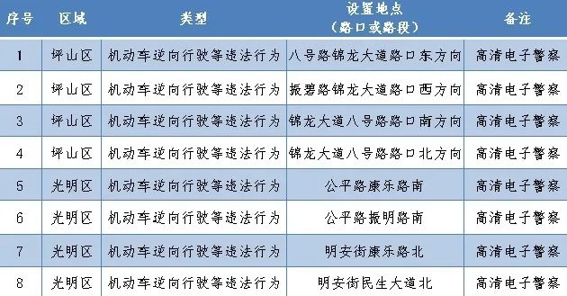 新增機(jī)動(dòng)車(chē)逆行高清電警設(shè)備8套,其中坪山區(qū)新增4套,光明區(qū)新增4套。