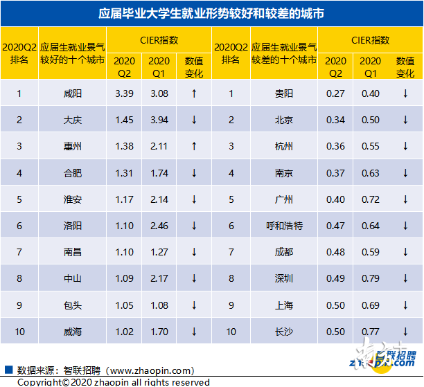 《報(bào)告》顯示,二季度應(yīng)屆生CIER指數(shù)較高的城市為二、三線城市,例如,咸陽(yáng)、大慶、惠州、合肥和淮安等,這些城市的CIER指數(shù)均要高于1。而在應(yīng)屆生就業(yè)景氣較差的城市中,北上廣深等一線城市,以及杭州、南京、成都等新一線城市的應(yīng)屆生CIER指數(shù)相對(duì)較低,就業(yè)競(jìng)爭(zhēng)相對(duì)激烈。