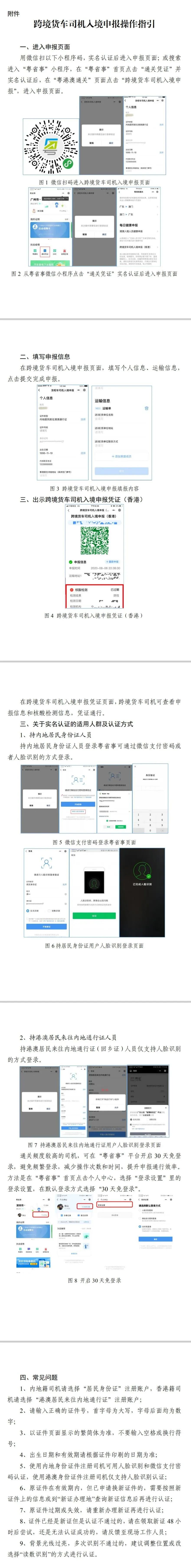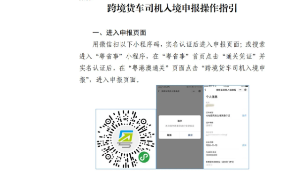 一、跨境司機入境前應(yīng)在“粵省事”微信小程序(粵省事—粵康碼—粵港澳通關(guān)—跨境貨車司機入境申報)中準(zhǔn)確申報運輸作業(yè)任務(wù)相關(guān)信息,包括作業(yè)目的地詳細(xì)信息(工廠/倉庫名稱及所在街道)、內(nèi)地手機號碼及相關(guān)個人信息,相關(guān)操作指引詳見附件。入境后所申報手機號碼將會接收提醒短信。未安裝GPS定位系統(tǒng)和ETC電子不停車收費系統(tǒng)的入境貨車,需按照相關(guān)部門安排前往指定場地免費安裝GPS和ETC系統(tǒng)。