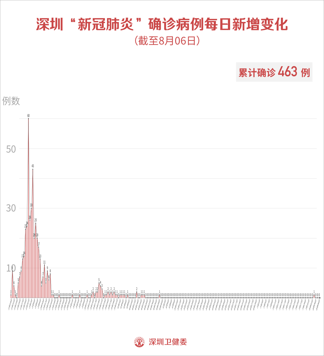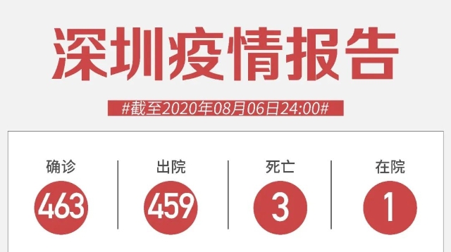 截至8月6日24時,深圳市累計報告新冠肺炎確診病例463例。目前在院1例。