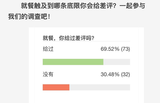 用餐后做出評(píng)價(jià),是消費(fèi)者的基本權(quán)利。針對(duì)“就餐差評(píng)”的問題,深圳新聞網(wǎng)昨天發(fā)起了網(wǎng)友投票。結(jié)果,有69.52%的網(wǎng)友表示,他們?cè)?jīng)在用餐后給過差評(píng)。在給出差評(píng)的原因中,“服務(wù)態(tài)度差”、“太難吃”高居前兩名。對(duì)商家提出中肯的批評(píng)與監(jiān)督,是每個(gè)消費(fèi)者享有的基本權(quán)利,中肯的評(píng)價(jià)不僅是商家進(jìn)步的動(dòng)力,也讓更多網(wǎng)友能夠快速篩選定位商家,從而促進(jìn)行業(yè)的良性發(fā)展。