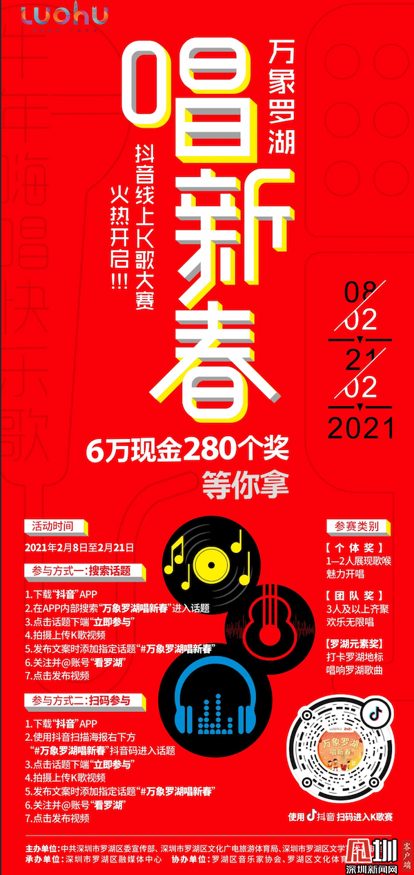 同時(shí),羅湖區(qū)還推出了趣味十足的“萬象羅湖唱新春”抖音線上k歌大賽,營造全民k歌迎新春的熱潮。唱你心中想唱的歌曲,歌曲形式、曲目不限,只要內(nèi)容積極向上,且充滿正能量即可。此次比賽共設(shè)6萬元現(xiàn)金280個(gè)獎(jiǎng),最高可獲得2888元現(xiàn)金!