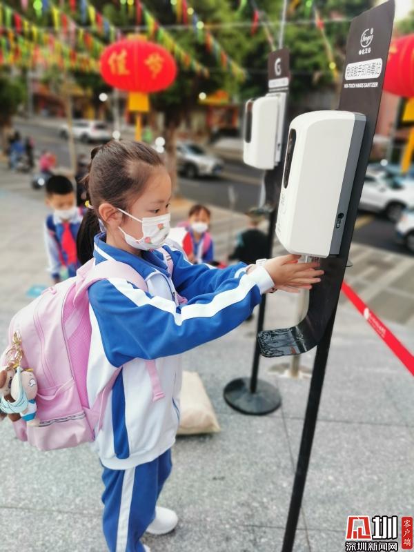 松泉實驗小學(xué),孩子們主動洗手消毒。