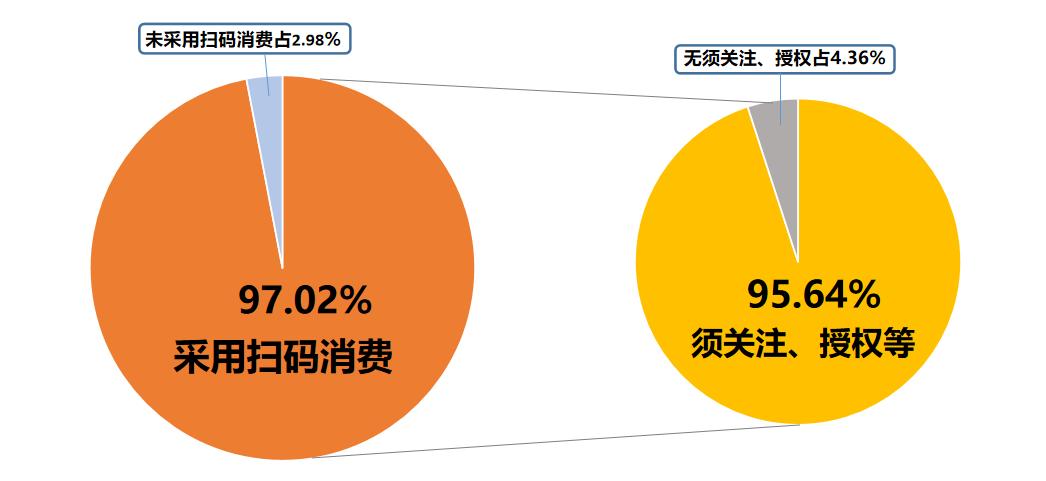 根據(jù)深圳市消委會初步調(diào)查,共走訪了36個大中型商超,26個連鎖餐飲品牌。統(tǒng)計數(shù)據(jù)顯示,有97.02%的商家采用了掃碼消費,其中95.64%的商家在掃碼后仍須關(guān)注或授權(quán)才可進行消費。