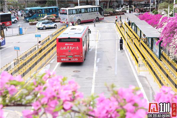 三月末,春深處,粉紫色的花朵環(huán)繞著停車場(chǎng)肆意綻放,與深圳藍(lán)相映成趣。