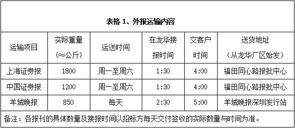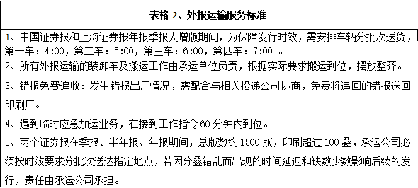 深圳報(bào)業(yè)集團(tuán)印務(wù)有限公司現(xiàn)承印外報(bào)主要有上海證券報(bào)、中國(guó)證券報(bào)、羊城晚報(bào)等重要報(bào)刊,根據(jù)各報(bào)刊的具體要求,安全、準(zhǔn)時(shí)、保質(zhì)、保量地運(yùn)送每天生產(chǎn)發(fā)行數(shù)量的各報(bào)刊到指定地點(diǎn)或客戶手中,具體運(yùn)輸發(fā)行內(nèi)容和標(biāo)準(zhǔn)詳見(jiàn)下面表格。