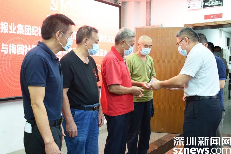 黨課結(jié)束后,陳鵬等代表深圳報業(yè)集團(tuán)一行對社區(qū)老黨員進(jìn)行慰問,并向老黨員代表送上慰問金和禮包,隨后,陳鵬向梅園社區(qū)“光榮在黨50年”老黨員們頒發(fā)紀(jì)念章,“你們辛苦了,我們要向你們學(xué)習(xí),希望你們注意身體,繼續(xù)為社區(qū)做貢獻(xiàn)。”陳鵬捧起紀(jì)念章,為老黨員們戴上,并對老黨員們送上關(guān)心和祝福。