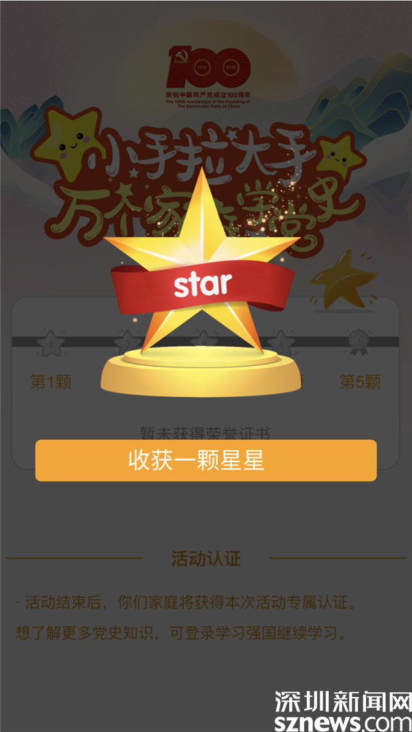 本次活動面向羅湖轄區(qū)中小學(xué)學(xué)生及家庭。6月28日至7月8日,學(xué)生及家長可以下載“羅湖Plus”APP,點擊首頁“服務(wù)”進入“小手拉大手黨史學(xué)習(xí)”活動專欄并完成注冊?;顒悠陂g,每完成1次打卡即答對全部題目,可獲得1次親子“點亮星星”的機會。每輪答題如有1道答錯即為“闖關(guān)失敗”,可以點擊“再來一次”繼續(xù)答題,直到全部答對為止。10天內(nèi)完成5次打卡任務(wù),即可點亮5顆小星星獲得“升旗手”個人榮譽證書。