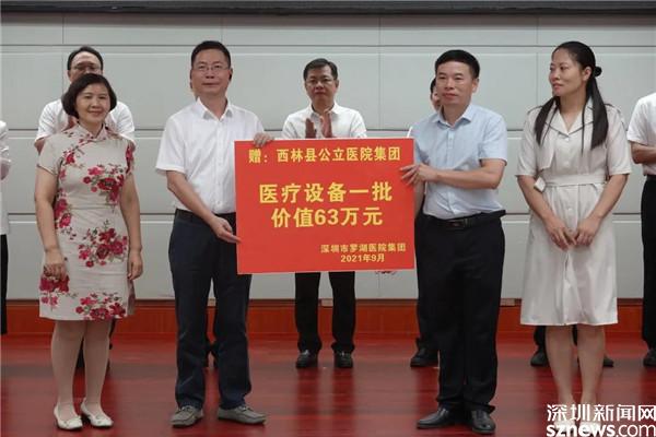鄉(xiāng)村振興,關(guān)鍵在人,醫(yī)療和教育等基礎(chǔ)設(shè)施同樣起不可或缺的作用。此次考察中,羅湖區(qū)向西林縣人民醫(yī)院捐贈(zèng)了一批醫(yī)療設(shè)備。據(jù)了解,自2017年對口幫扶西林縣以來,羅湖區(qū)共派出8批醫(yī)療隊(duì)、92人次駐點(diǎn)西林縣各醫(yī)療衛(wèi)生單位,累計(jì)捐贈(zèng)價(jià)值約1000萬元的醫(yī)療儀器和設(shè)備,充分保障了地方百姓的醫(yī)療需求,推動(dòng)了西林縣公立醫(yī)院集團(tuán)的發(fā)展。