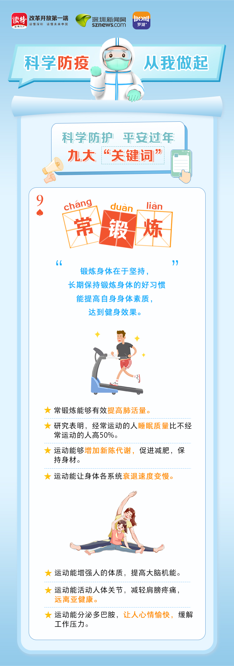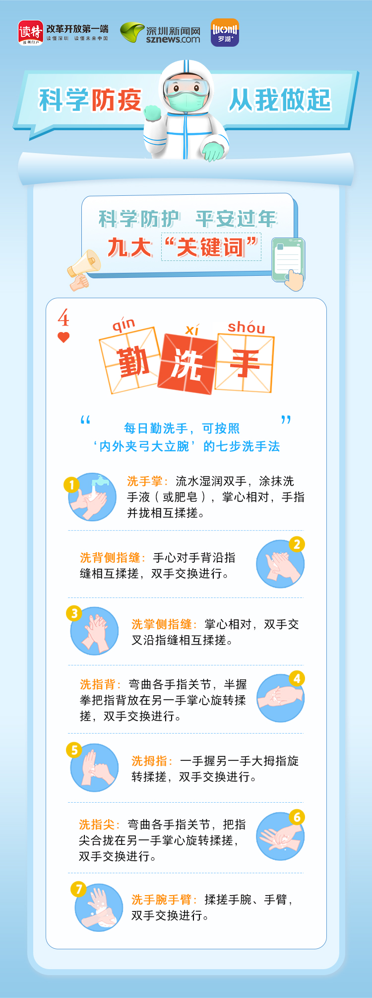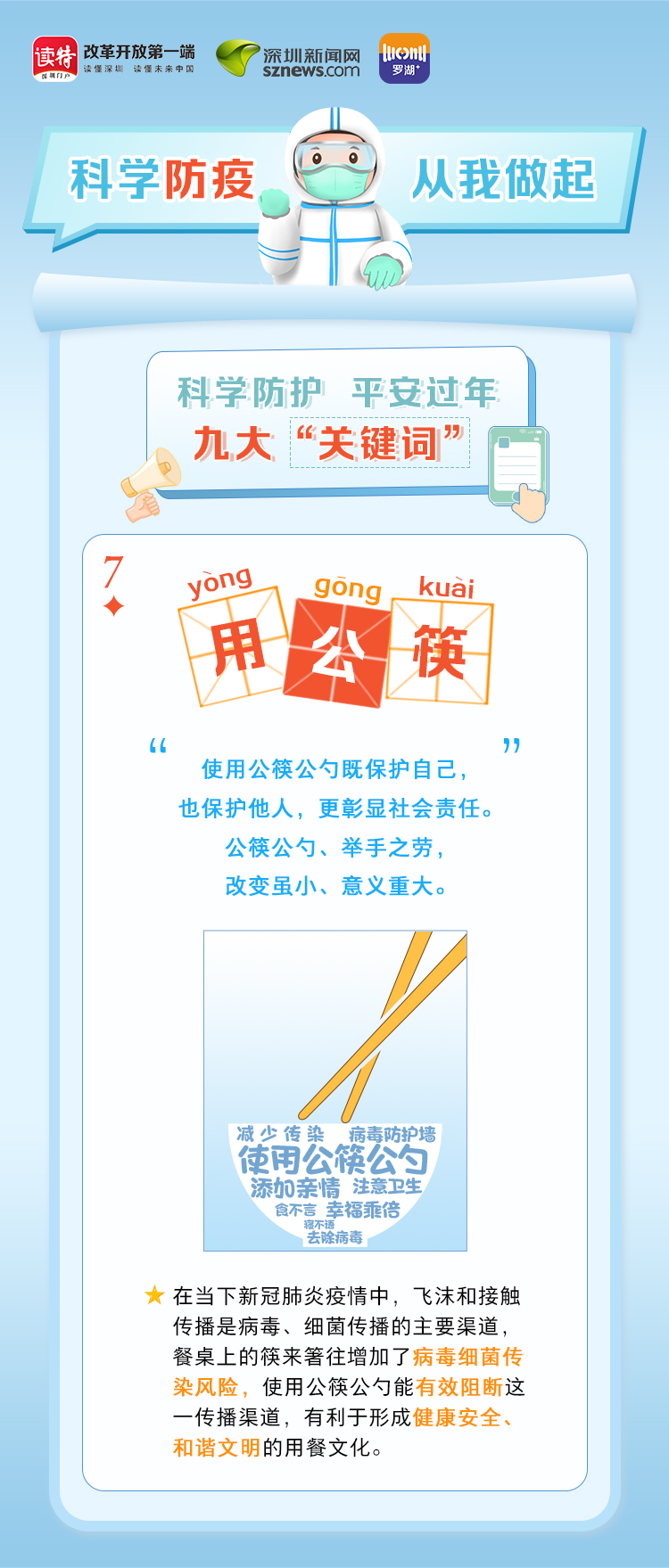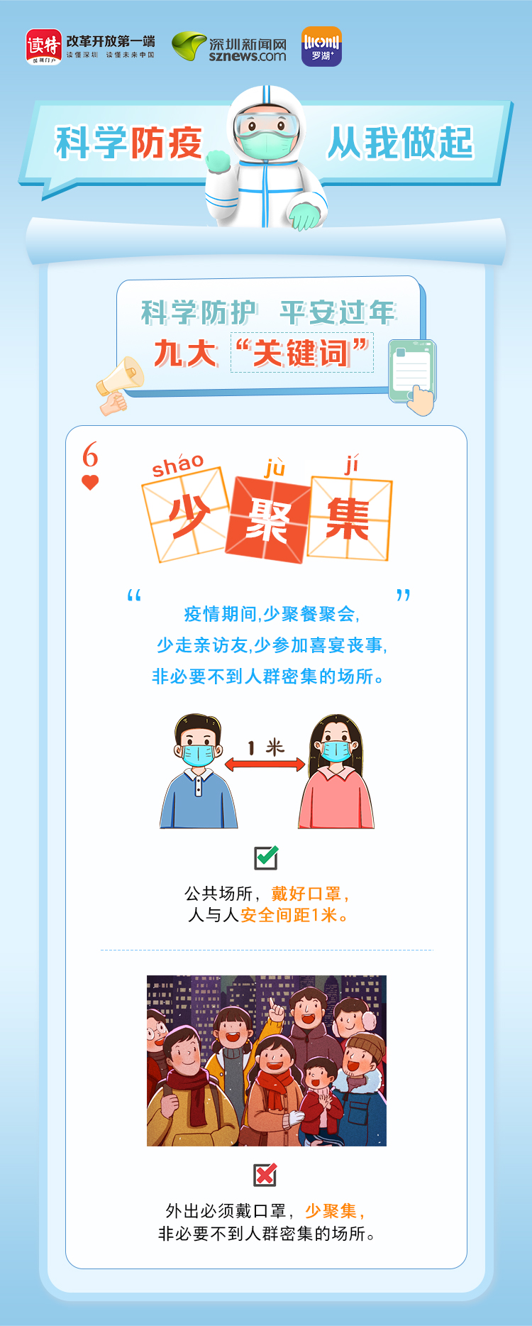 為更好地保護(hù)自己和他人的健康,度過一個(gè)祥和平安的春節(jié),請(qǐng)查收《科學(xué)防護(hù)平安過年九大“關(guān)鍵詞”》。在這場(chǎng)沒有硝煙的戰(zhàn)斗中,公安干警、醫(yī)護(hù)人員、社區(qū)工作者、志愿者始終堅(jiān)守在一線,齊心協(xié)力、眾志成城抗擊疫情。讓我們攜手并進(jìn),共同抗疫,采用科學(xué)有效的方式做好自身防護(hù),不僅對(duì)自己負(fù)責(zé),更是對(duì)家人負(fù)責(zé),對(duì)社會(huì)負(fù)責(zé)。