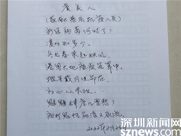 他在《虞美人》寫道:新冠病毒何時(shí)了?凄切知多少,冬去春來起妖風(fēng),港粵大地瘟疫籠罩中。披星戴月使命在,初心從未改,魅魑肆虐幾曾愁?痛打鬼怪屁滾又尿流。