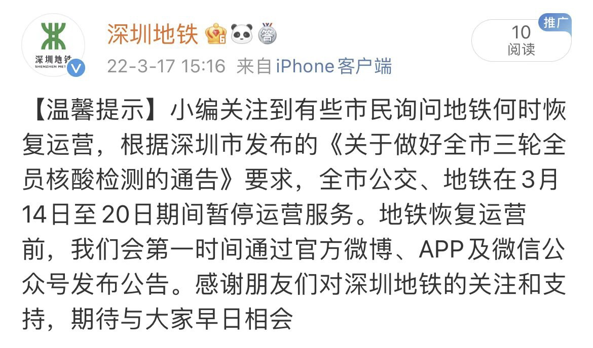 對(duì)此,記者向深圳地鐵求證,深圳地鐵表示,根據(jù)深圳市發(fā)布的《關(guān)于做好全市三輪全員核酸檢測(cè)的通告》要求,全市公交、地鐵在3月14日至20日期間暫停運(yùn)營(yíng)服務(wù)。地鐵恢復(fù)運(yùn)營(yíng)前,深圳地鐵會(huì)第一時(shí)間通過(guò)官方微博、APP及微信公眾號(hào)發(fā)布公告。