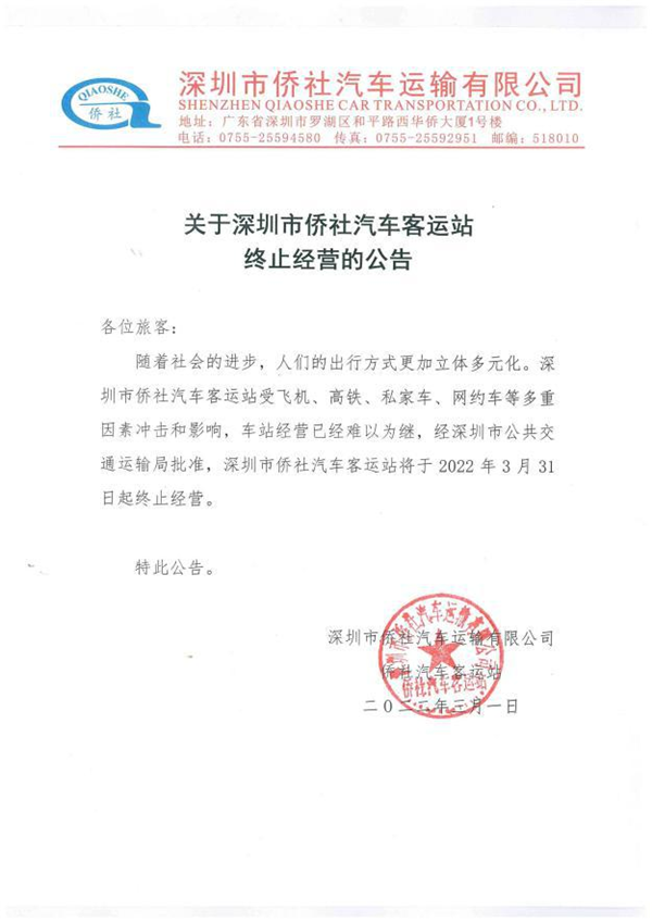 近日,記者從深圳市交通運(yùn)輸局羅湖管理局獲悉,自2022年3月31日起,深圳市僑社汽車客運(yùn)站終止經(jīng)營(yíng),這個(gè)營(yíng)業(yè)了31年的“老牌”汽車客運(yùn)站,正式宣布退休。