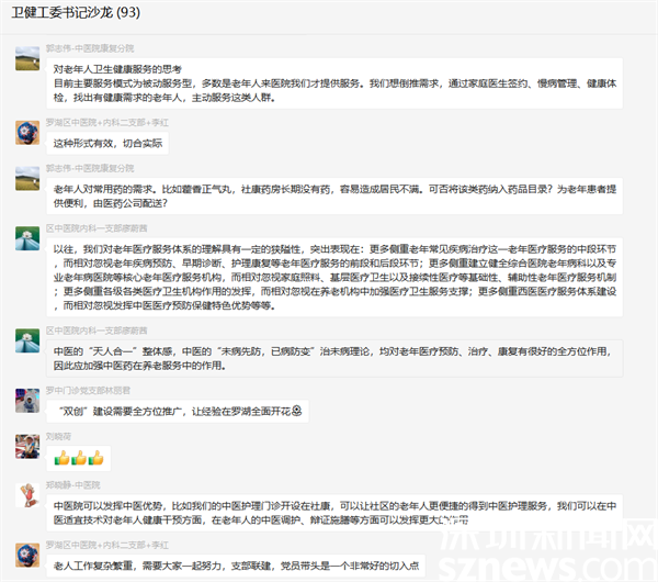 羅湖區(qū)現(xiàn)有常住60歲以上老人9.8萬(wàn)人,65歲以上老人5.3萬(wàn)人。如何更好地推動(dòng)“老年友好型醫(yī)院、老年友好型社區(qū)”創(chuàng)建,使轄區(qū)老年人共享羅湖醫(yī)改成果,5月25日晚8點(diǎn),區(qū)委衛(wèi)生健康工委基層“書記工作室”書記沙龍?jiān)俅螀R聚68名黨支部書記,在線上進(jìn)行“頭腦風(fēng)暴”,為“雙創(chuàng)建設(shè)”聚集體智慧、群策群力、出謀獻(xiàn)策,充分體現(xiàn)了區(qū)委衛(wèi)生健康工委基層黨組織的聚合力、執(zhí)行力和創(chuàng)造力。