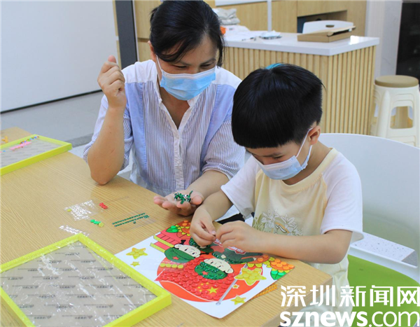 最后一個來到的鄭權(quán)桸小朋友屬于“空降”,因為他沒報上名。招募時,15個名額很快就報滿了。但是鄭權(quán)桸很想?yún)⒓舆@個活動,媽媽就帶著他來試試,現(xiàn)場社工也很歡迎他的加入。鄭權(quán)桸小朋友全神貫注投入到畫作中,把每個紐扣都放在最佳位置,直到把全部紐扣貼完。他是最后一個來,也是最后一個走的。