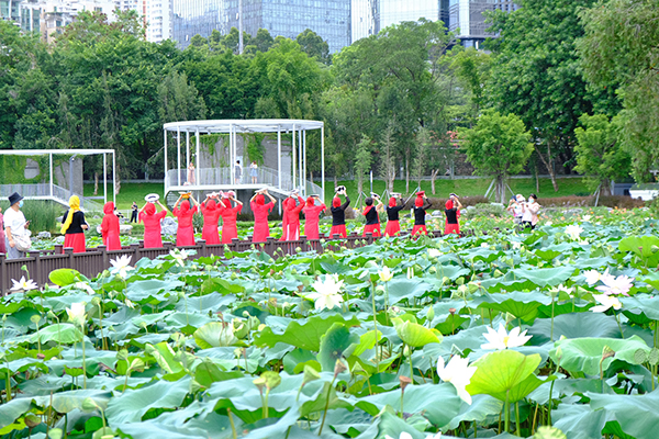 走進(jìn)公園,映入眼簾的是一望無(wú)際的荷葉。一陣微風(fēng)拂過(guò),嫩綠的蓮蓬輕輕點(diǎn)頭,碩大的荷葉隨風(fēng)搖擺,讓人心曠神怡。荷塘邊,身著紅色連衣裙的阿姨們正隨著音樂(lè)舞動(dòng);池塘的另一頭,身著碧綠服裝的阿姨們熱情洋溢地表演著扇子舞。
