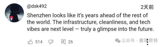 (“深圳看起來比世界其他地方領(lǐng)先好幾年?;A(chǔ)設(shè)施、清潔度和科技氛圍都是一個新的水平——真正讓人看到了未來。”)