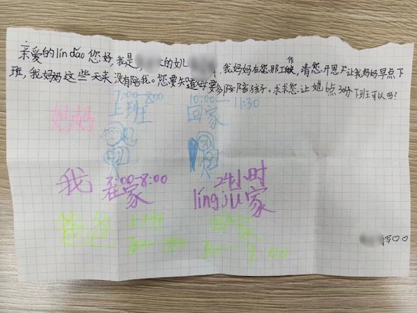 “親愛的lín dǎo您好……我媽媽在您那工作,這些天都沒能陪我,請你讓她6點30分下班可以嗎?”,1月13日,羅湖區(qū)南湖街道羅湖社區(qū)黨委書記姜德榮收到了一封特別的來信。這封信來自社區(qū)工作人員彭女士可愛的女兒,信上的內容圖文并茂,表達了一個10歲小女孩的小心愿,希望媽媽可以早點下班,回家陪她。