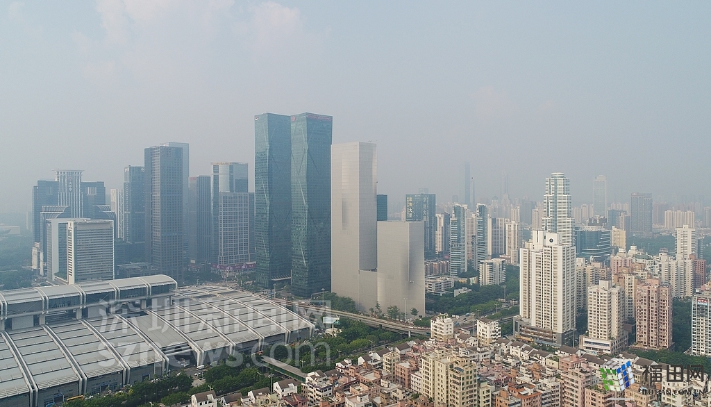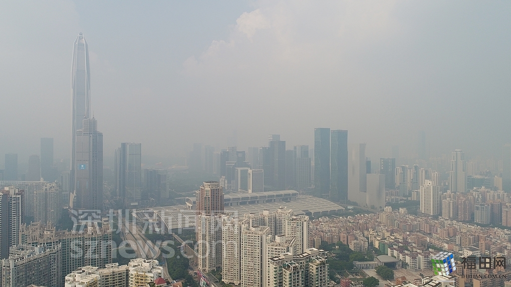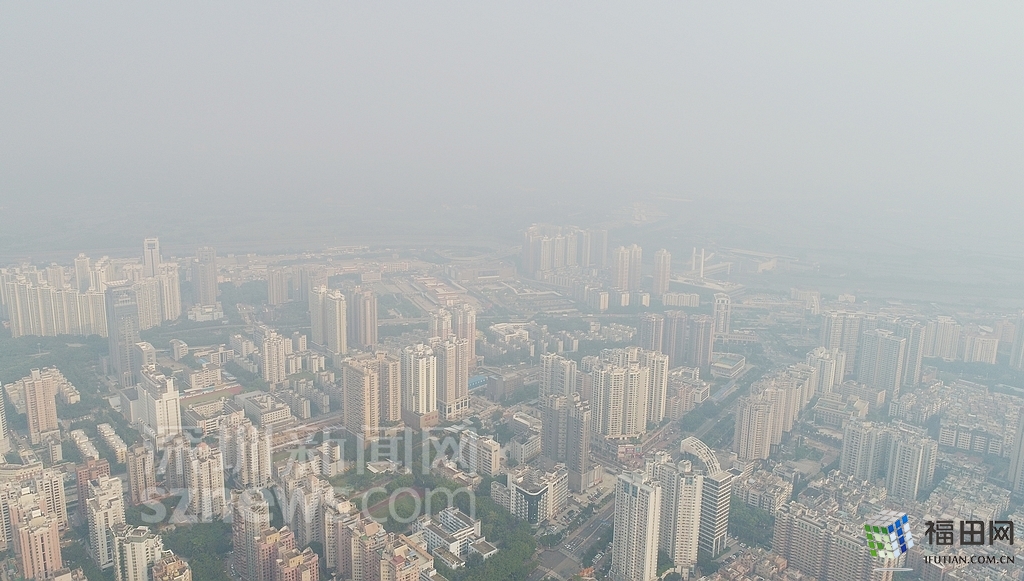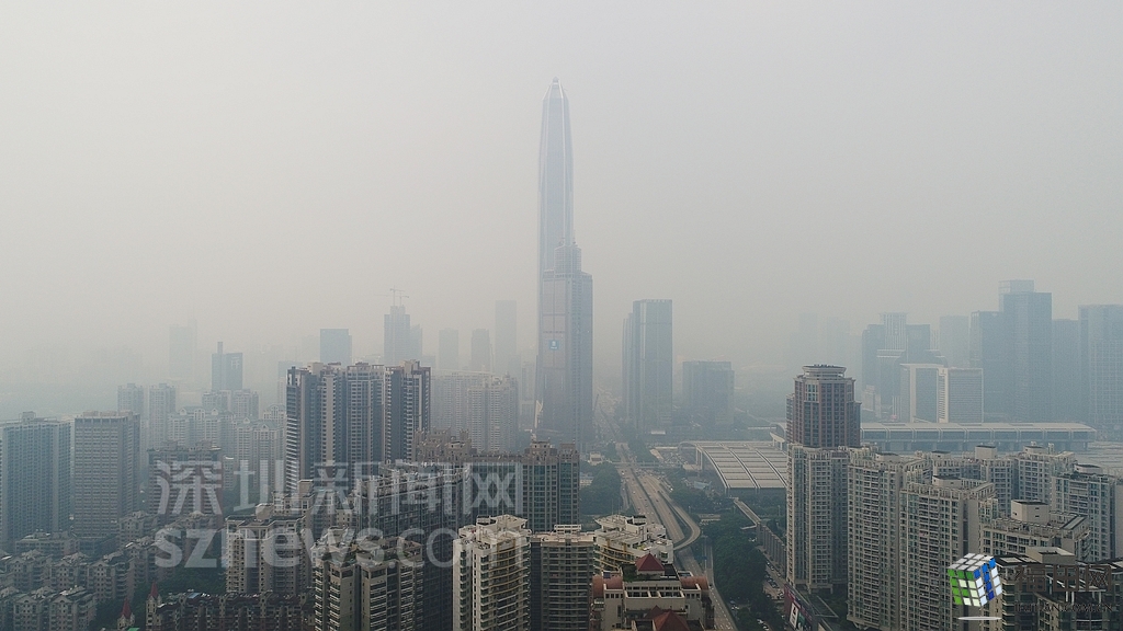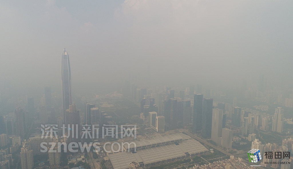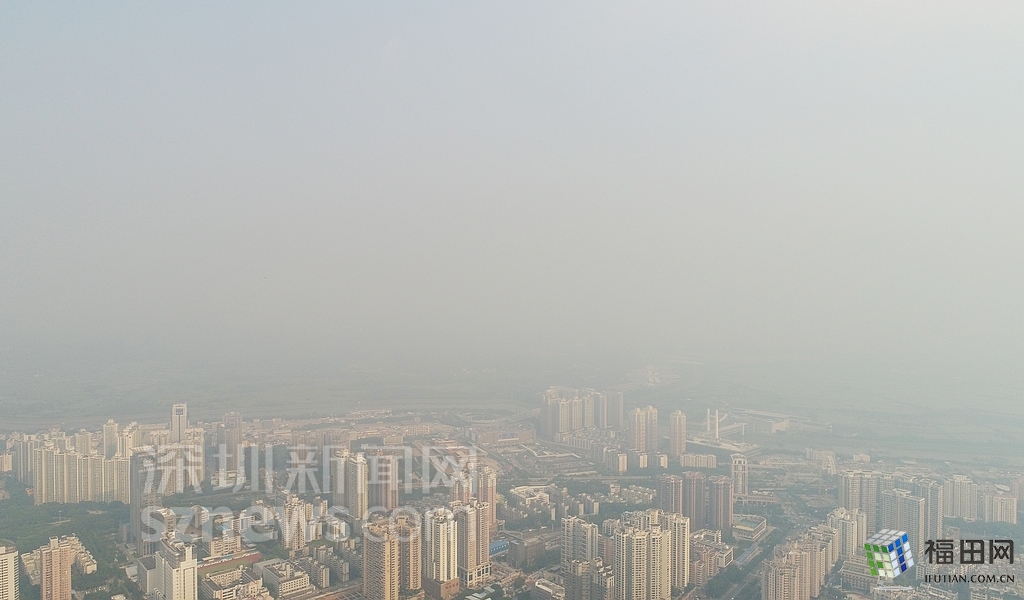 無(wú)人機(jī)在數(shù)百米高空俯瞰灰霾籠罩下的深圳中心區(qū),大半個(gè)城區(qū)都看不清楚。