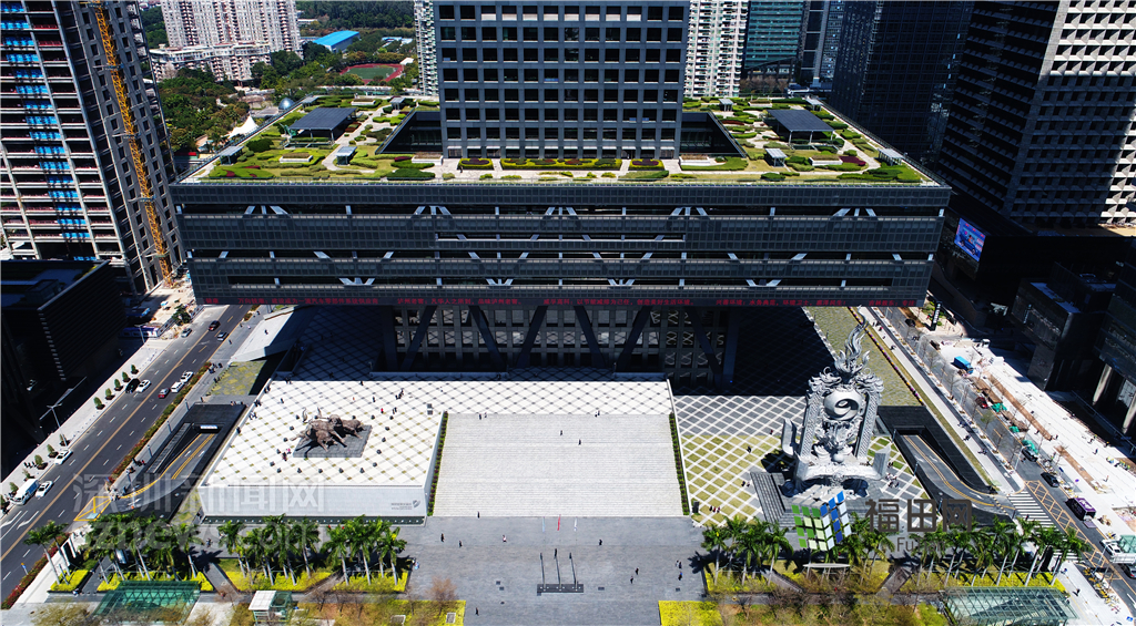 深交所由方正的塔樓和空中懸挑的裙樓所組成,大廈底座被抬升至30多米形成一個(gè)巨大的“漂浮平臺(tái)”。