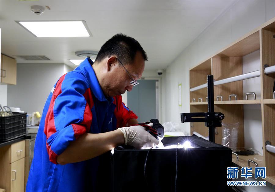 中國科學(xué)院海洋研究所李新正研究員在“探索一號”科考船上拍攝樣品(5月19日攝)。新華社記者 張建松 攝