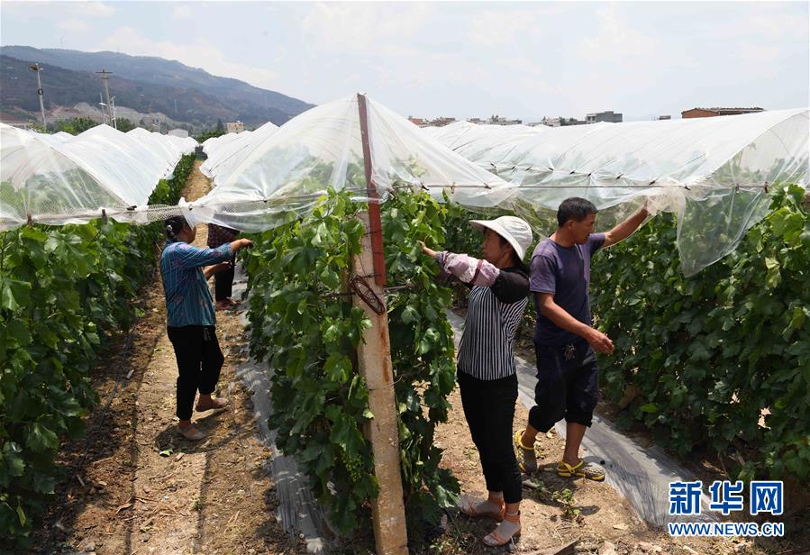 5月22日,曲靖市麒麟?yún)^(qū)珠街街道中所村村民在村合作社種植的葡萄園修剪枝葉。新華社記者楊宗友攝