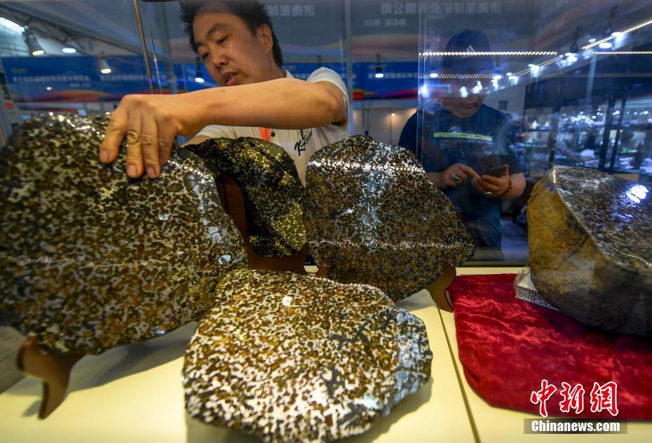 6月15日,第十一屆新疆觀賞石、和田玉精品博覽會(huì)在位于新疆烏魯木齊市紅光山的新疆國(guó)際會(huì)展中心開幕,本次博覽會(huì)參展種類涵蓋珠寶、玉石、礦石、隕石、觀賞石等,吸引眾多奇石玩家到場(chǎng)“以石會(huì)友”,打造獨(dú)具特色的“品石”盛宴。圖為曾引起各方關(guān)注,6月1日降落在云南西雙版納州景洪市的隕石“空降”本屆石博會(huì)展出。中新社記者劉新 攝