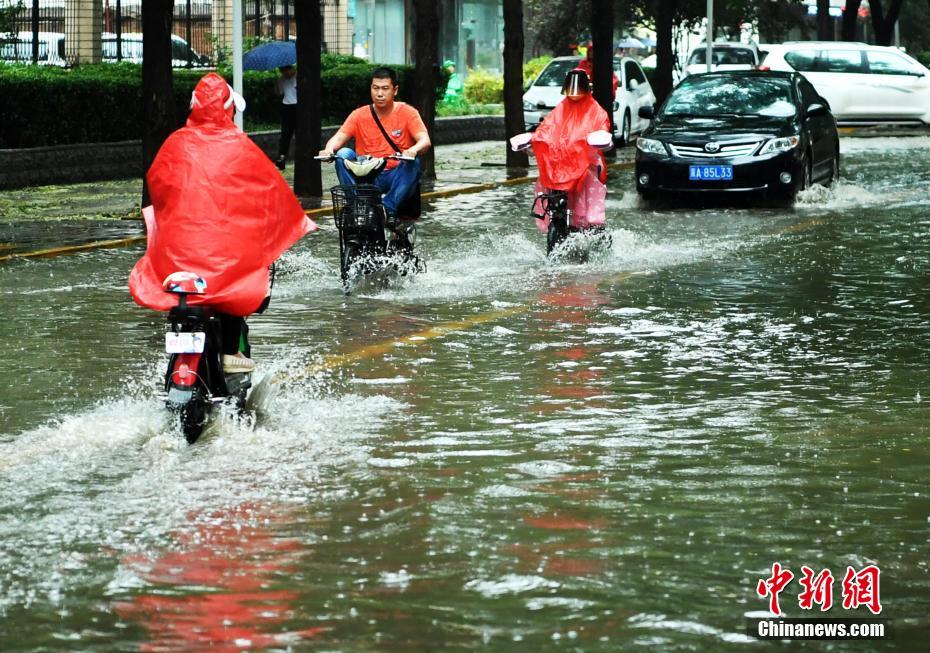 7月16日下午,河北石家莊一條馬路積水嚴(yán)重,民眾涉水騎行。當(dāng)日,該省氣象臺發(fā)布暴雨藍(lán)色預(yù)警,承德、雄安新區(qū)、廊坊北部、石家莊中西部、邢臺西部等多地遭受暴雨襲擊。中新社記者翟羽佳 攝
