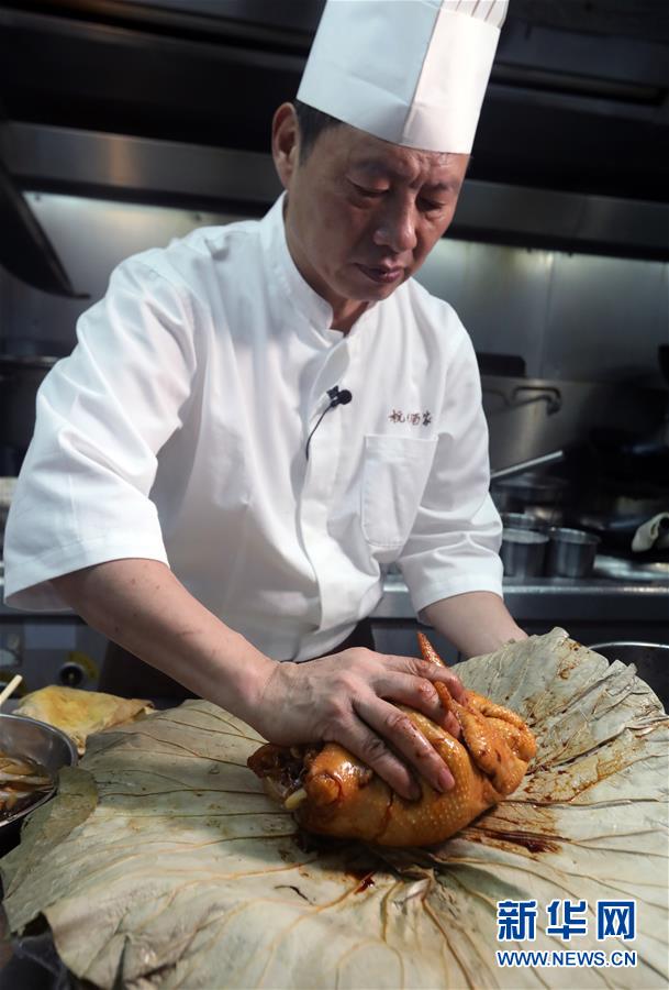 杭州酒家老板吳瑞康現(xiàn)場制作本店招牌菜“叫化雞”(6月16日攝)。 金庸在武俠小說《神雕俠侶》中借郭靖之口說過: “為國為民,俠之大者?!蔽鋫b精神在香港備受推崇,有其心向中華文化的情感基礎。在這個國際美食之都,品味舌尖上的武俠味,內中的感覺別有深意。新華社記者 李鵬 攝