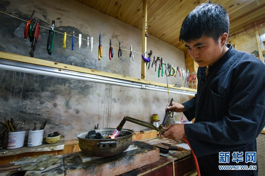 龍懂陽(yáng)的弟弟龍?zhí)?yáng)也是銀飾工藝傳人。和哥哥不同,弟弟主打的是銀飾文化體驗(yàn)游,用自家傳統(tǒng)苗寨開(kāi)設(shè)民宿,游客在此居住的同時(shí),還能學(xué)習(xí)體驗(yàn)銀飾品制作。每年暑期一到,家長(zhǎng)孩子絡(luò)繹不絕。新客源、新銷(xiāo)路、新模式帶動(dòng)雷山縣銀飾業(yè)不斷發(fā)展壯大,成為脫貧攻堅(jiān)的重要產(chǎn)業(yè)。2017年,雷山縣控拜、麻料、烏高三個(gè)村銀飾品及相關(guān)產(chǎn)業(yè)銷(xiāo)售額超過(guò)1.5億元,吸引很多外出打工的年輕人回家創(chuàng)業(yè)。苗寨鍛銀聲在綠水青山間響遍千戶(hù),也漸漸走出大山,聲名遠(yuǎn)播。新華社記者 李芒茫 攝