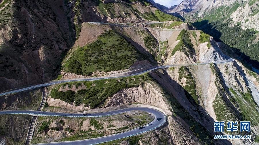 獨庫公路穿越海拔3390米的哈希勒根達(dá)坂(2017年7月13日無人機(jī)拍攝)。 新華社記者 江文耀 攝
