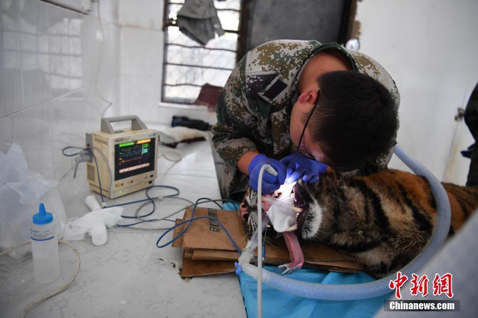 8月9日,位于昆明的云南野生動物園獸醫(yī)通過呼吸麻醉的方式,為園中一只一歲的老虎清潔牙。 中新社記者 劉冉陽 攝
